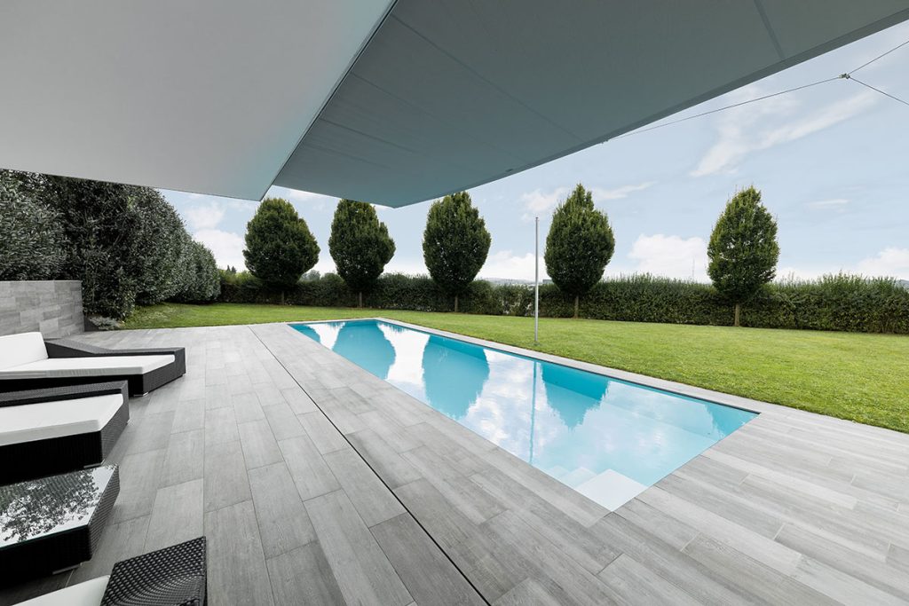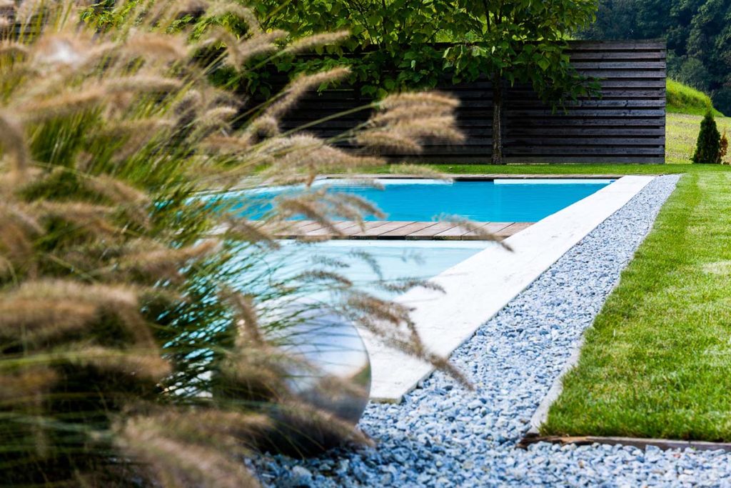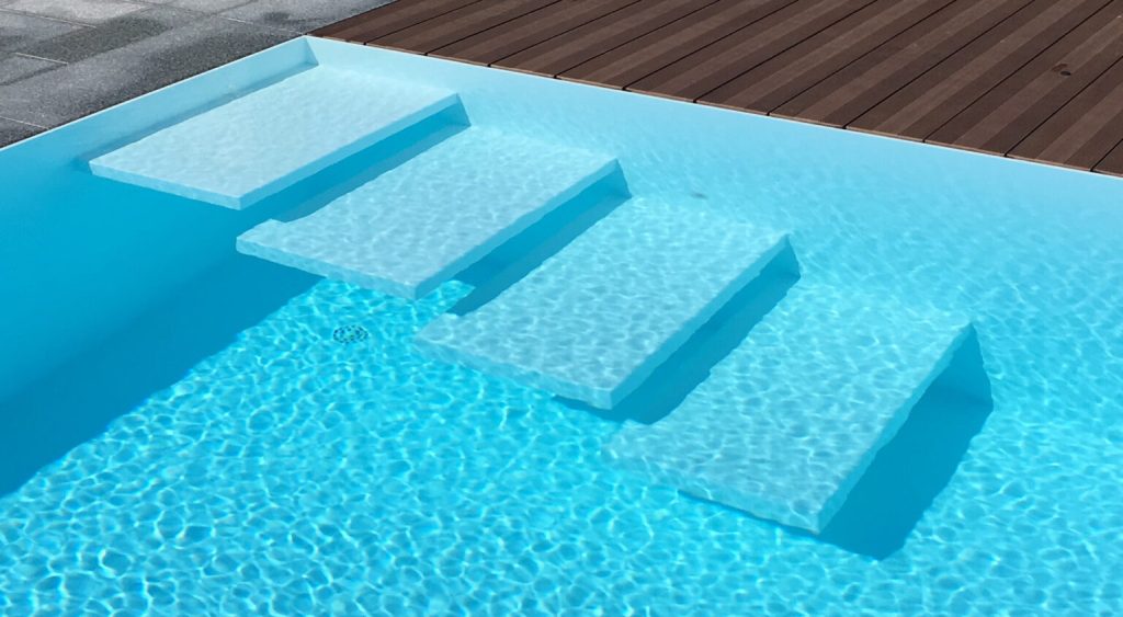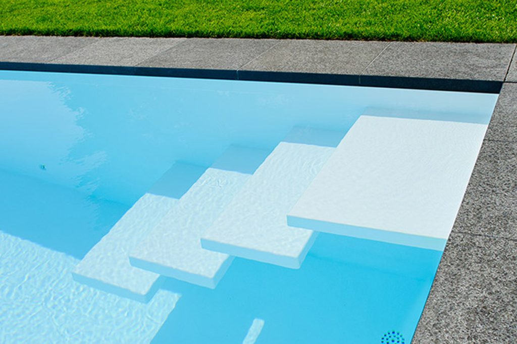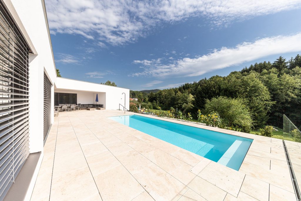 Dazu passend werden Einbauteile, wie Beleuchtung, Düsen und Abläufe plan verbaut und verschmelzen mit dem Becken. Die Stiege, welche frei schwebend anmutet, vollendet den in die Umgebung nahtlos integrierten Pool.