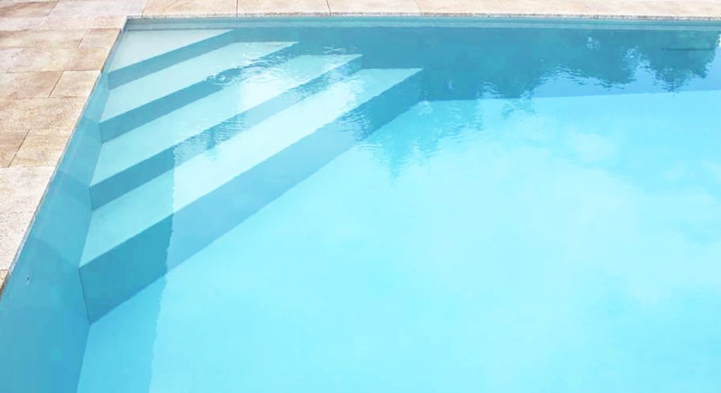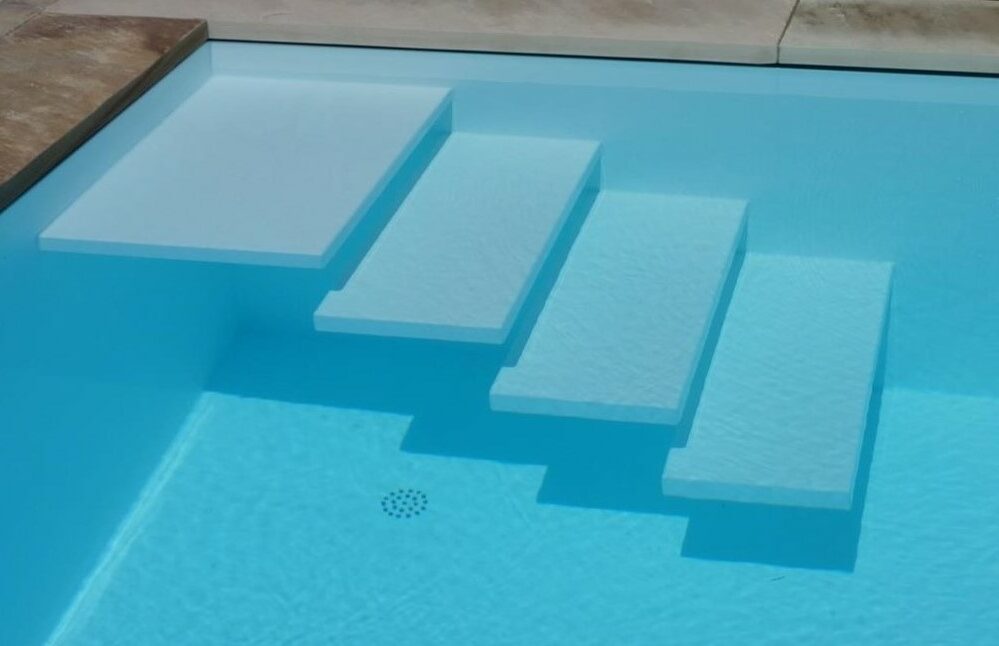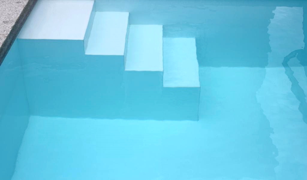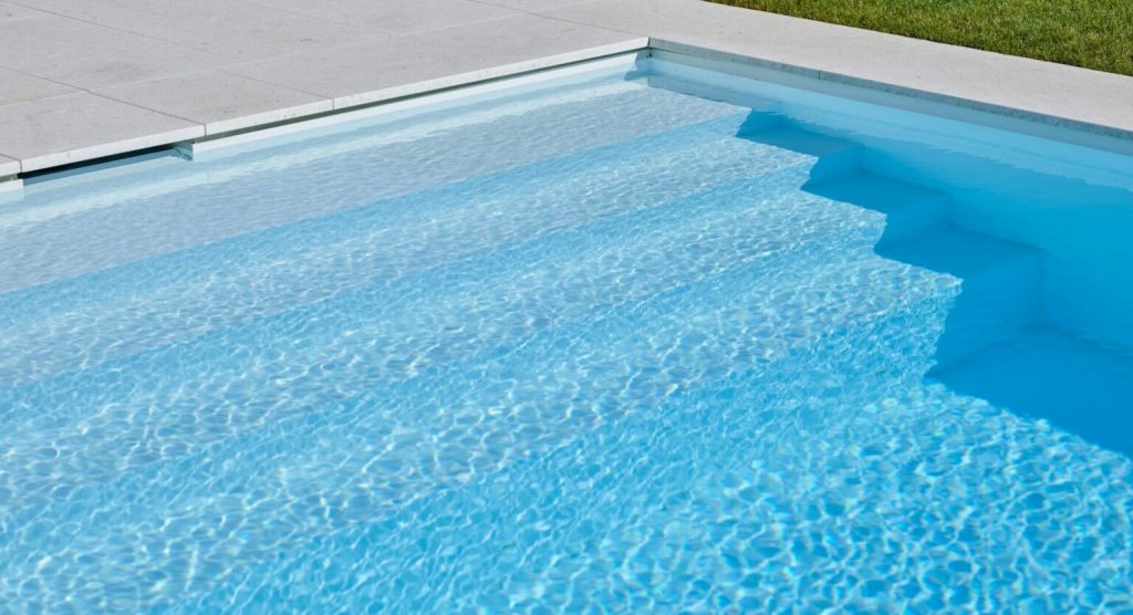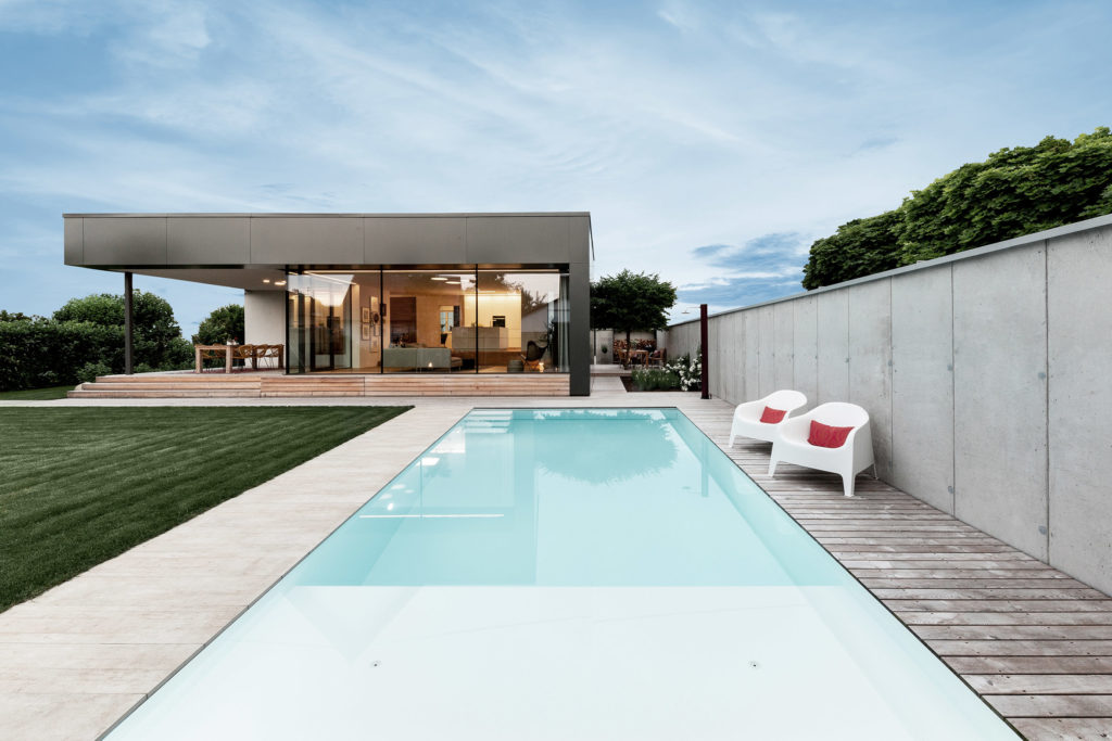 Dazu passend werden Einbauteile, wie Beleuchtung, Düsen und Abläufe plan verbaut und verschmelzen mit dem Becken. Die Stiege, welche frei schwebend anmutet, vollendet den in die Umgebung nahtlos integrierten Pool.