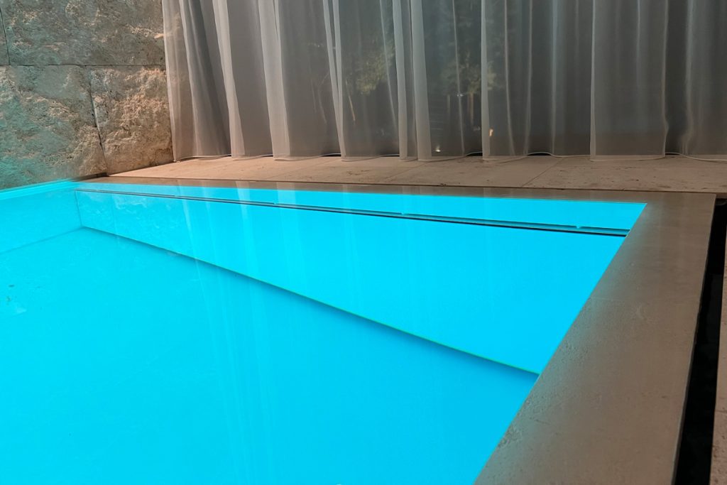 Einbauteile, wie LED-Beleuchtung und Düsen, werden bündig verbaut. Für die Technik kann optional ein Schacht direkt neben dem Becken positioniert werden. Dieser Schacht ist platzsparend und leicht zugänglich gestaltet. Der eigens von IPoR entwickelte Skimmer ermöglicht den hohen Wasserspiegel von zwei bis vier Zentimeter unter dem Beckenrand.