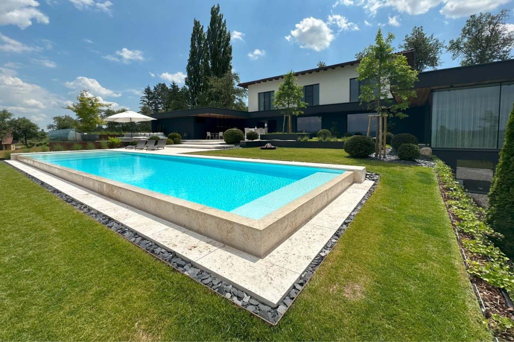 Das Premium Überlaufbecken aus eigener Produktion wird aus einem veredelten Spezialkunststoff hergestellt. Dieses Material zeichnet sich durch höchste Witterungsbeständigkeit und einfache Pflege aus. Die verdeckt eingebaute Überlaufrinne lässt einen sehr hohen Wasserspiegel zu. Dadurch integriert sich das Becken beinahe nahtlos in die Umgebung. Das harmonische Design wird durch die frei schwebende Treppe, die bündigen Scheinwerfer, Düsen und Bodenabläufe, abgerundet.